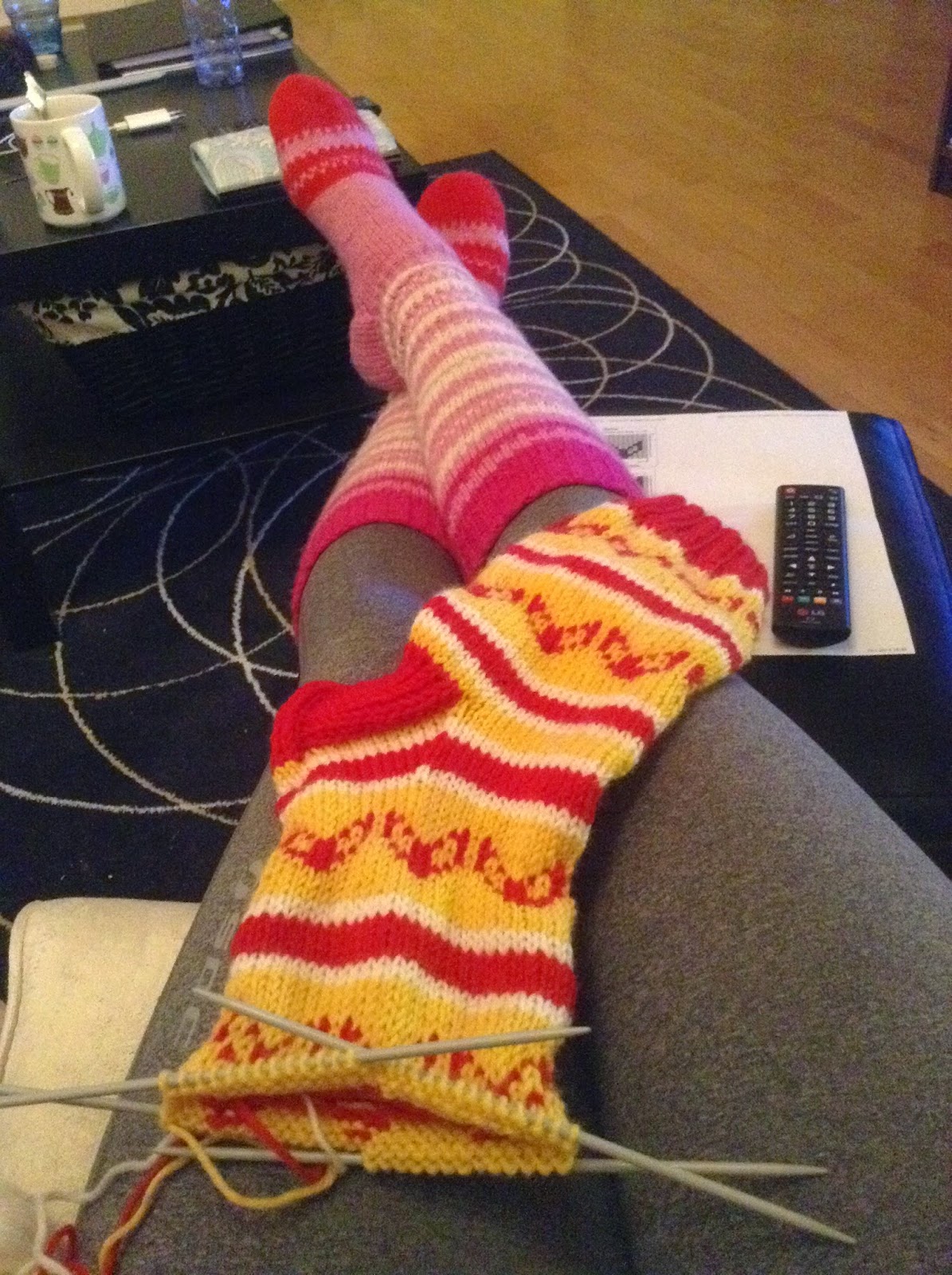 Pikapostauksen loppuun kuva viimeisimmistä sukista tekovaiheessa, todellisuudessa ovat päättelyä vaille valmiit. Mummoni tekemät ihanat sukat lämmittävät omia jalkoja näin talvipakkasissa <3